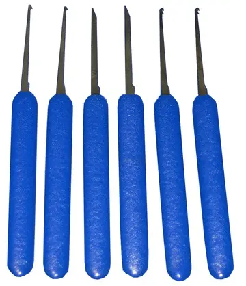- Pin Tumbler Tweezers: Specialized 6" tweezers with notched tips, designed to hold and place tiny tumbler pins with surgical precision.